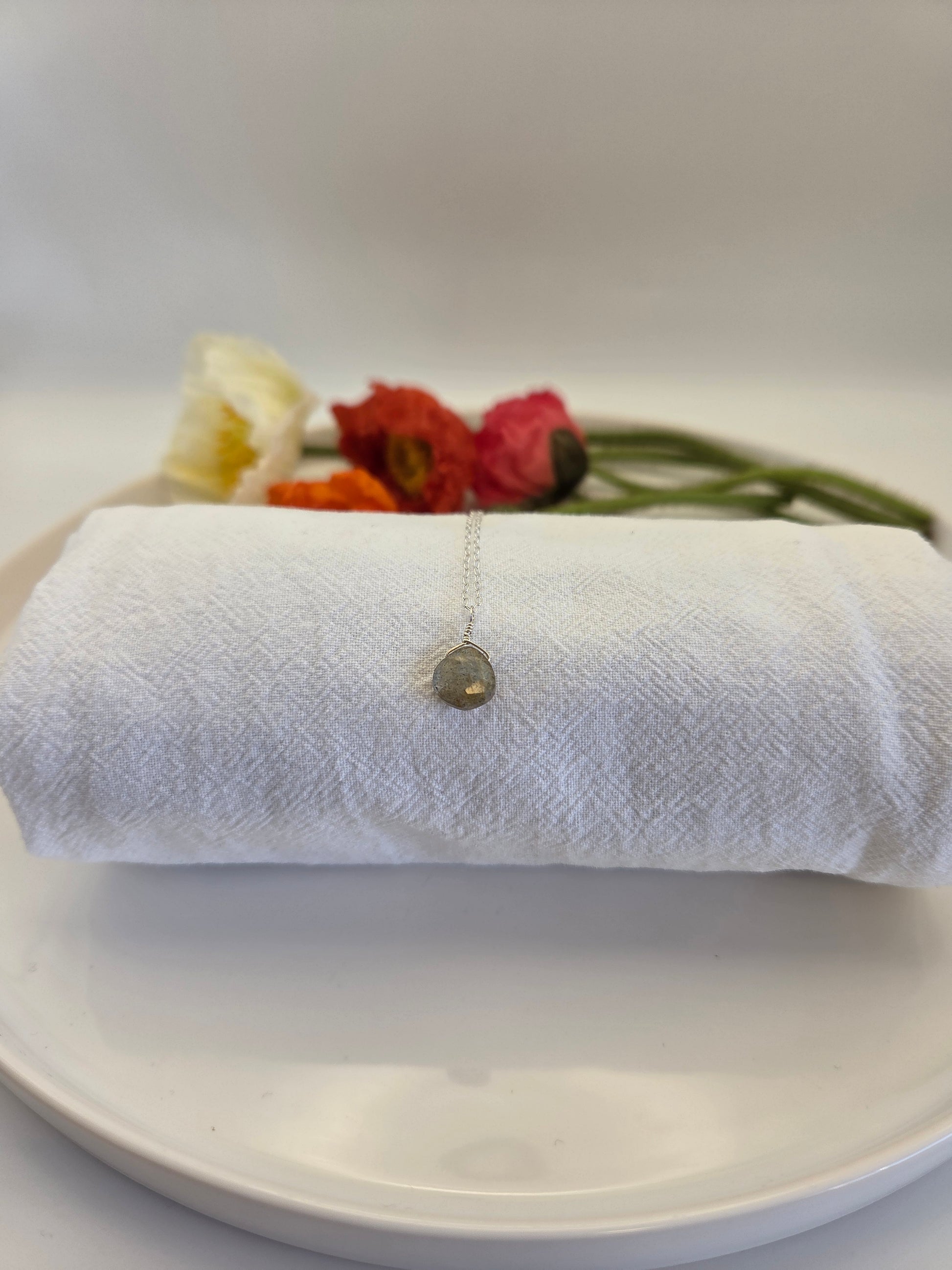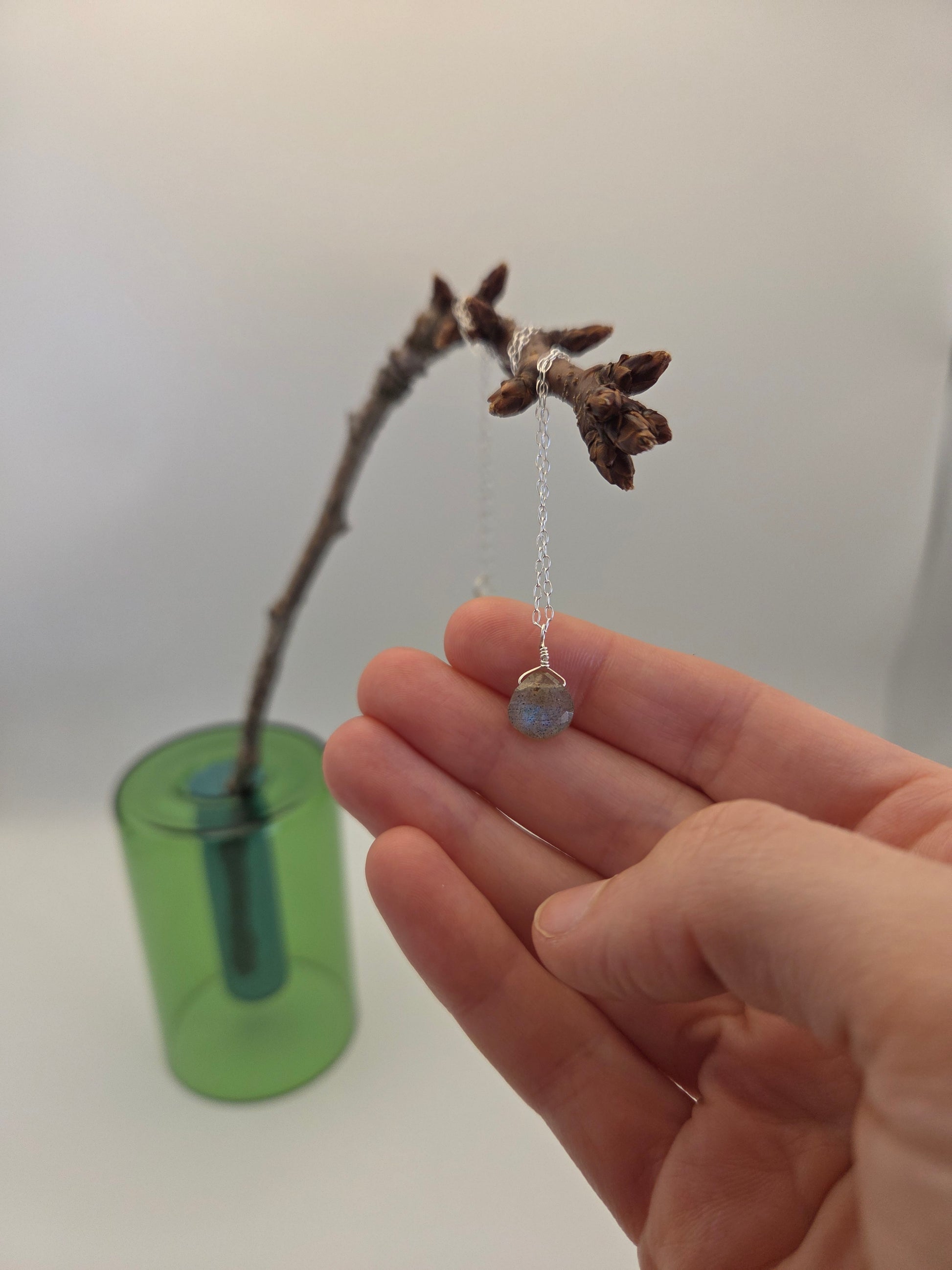 Dainty puffed teardrop labradorite pendant on a delicate sterling silver chain. Handmade in California ☀️