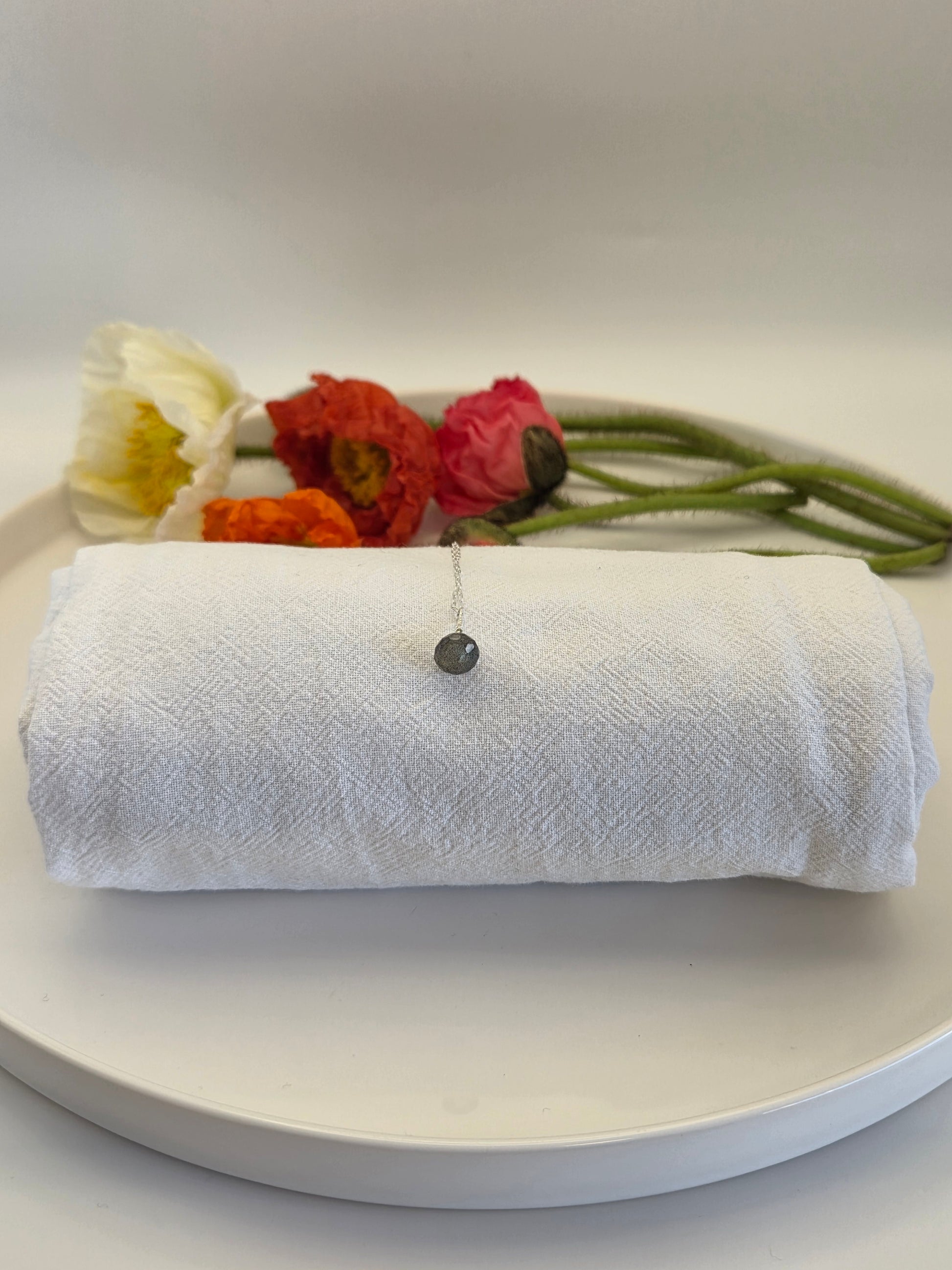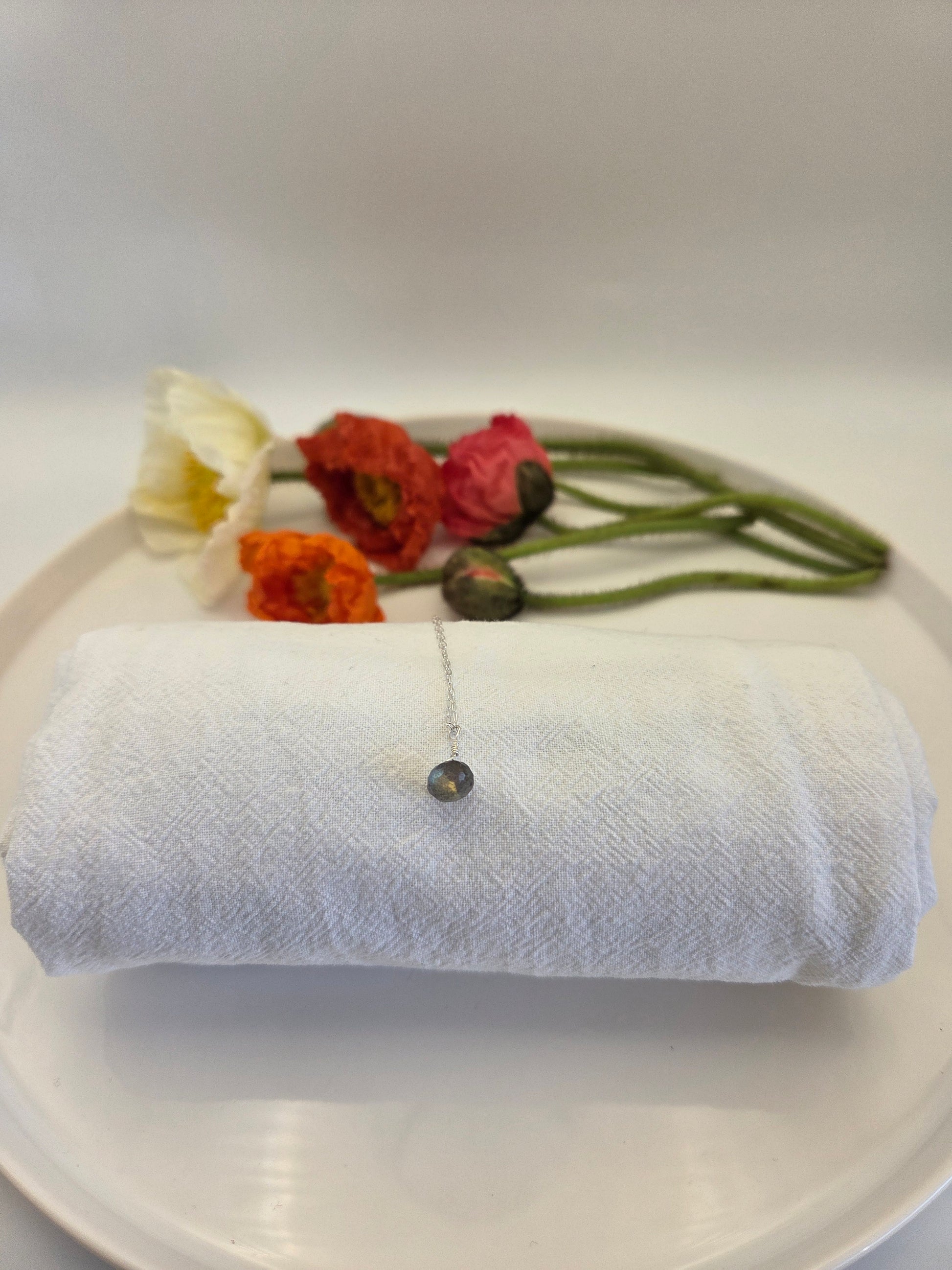 Dainty wide-base labradorite pendant on a delicate sterling silver chain. Handmade in California ☀️