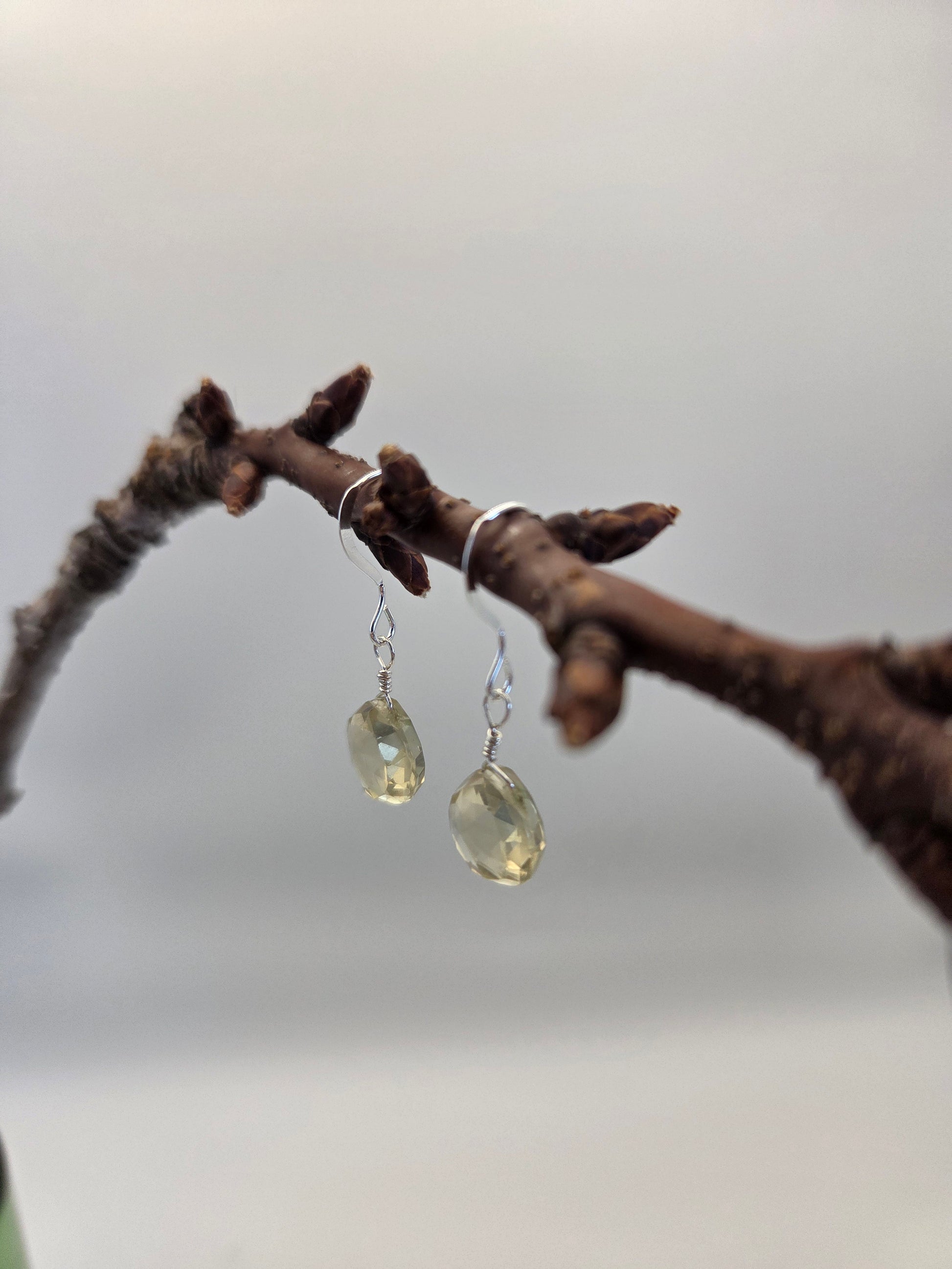 Dainty sterling silver earrings with clear, sparkling lemon quartz drops. Handmade in California ☀️